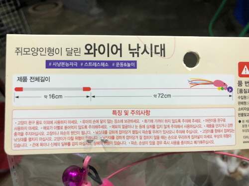 쥐모향인형이나 와이어는 별로 좋아하지 않는 물감이지만, 인형끝에 달려있는 끈들은 물감이의 취향이라 한번 구매해봤는데 꺼냈을때의 반응은 나쁘지 않네요! 와이어 낚시대 길이가 생각보다 길어서 놀아주기는 좋은것 같아요!(손잡이 16cm, 와이어 72cm)
