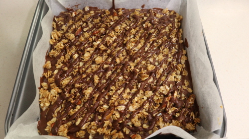 5.그위에 녹은초코를 부어준후, 그 위에 오트밀을 다시 뿌려줍니다.